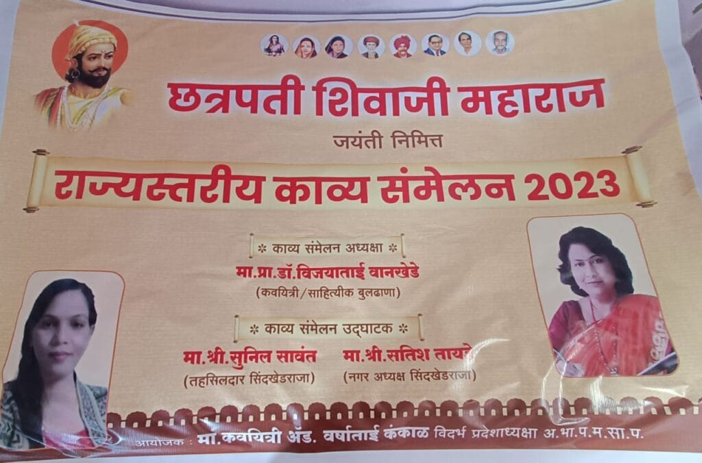 सिंदखेड राजा :- दिनांक १९ फेब्रुवारी २०२३ रोजी, नगरपरिषद सिंदखेड राजा येथे छत्रपती शिवाजी महाराजांच्या जयंतीनमित्त राज्यस्तरीय काव्य संमेलन आयोजित केले असून सकाळी ११ वाजता मा. तहसीलदार सावंत साहेब व नगर अध्यक्ष मा. सतीश जी तायडे यांचे हस्ते उद्घाटन होईल. संमेलनाच्या अध्यक्षपदी सुप्रसिद्ध साहित्यिक मा. डॉ. विजयाताई वानखेडे यांची सर्वानुमते निवड करण्यात आली आहे. तरी सर्व कवी/कवयित्री व साहित्यिकांनी हजर राहून कार्यक्रमाचा आनंद घ्यावा . तसेच ज्यांना काव्य संमेलना मध्ये सहभागी व्हायचे असेल त्यांनी मो. क्र. ९८८१९३९६५६ यावर संपर्क साधावा आणि मोठ्या प्रमाणात हजर राहून कार्यक्रमाची शोभा वाढवावी अशी विनंती काव्य संमेलनाच्या आयोजक मा. ॲड. वर्षा कंकाळ विदर्भ प्रदेश अध्यक्ष अ. भा. प. म. सा. प. यांनी केली.